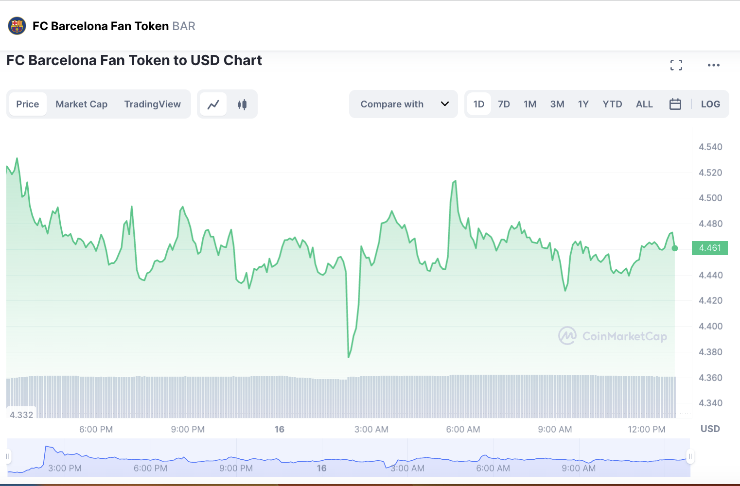 El fan token del FC Barcelona (BAR) pasó de $4,3547 a $4,61 en solo tres horas el 15 de enero (12:00 a 15:00 horas) para posteriormente oscilar entre los los $4,50 y $4,45 dólares. Además, su volumen de trading pasó de 5,44 a 6,61 millones de dólares en esas tres horas, y su capitalización de mercado creció 2,69% para quedar en 24.109 millones de dólares.