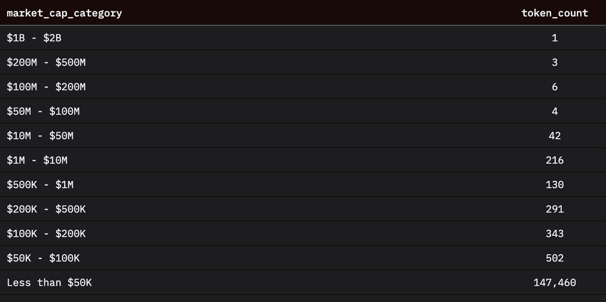 Solo nueve tokens (o 0.006%) superaron los 100 millones de dólares. Mientras tanto, el 98.5% de los tokens no lograron siquiera alcanzar los 50,000 dólares en capitalización de mercado. En otras palabras, el 98.5% de los proyectos eran esencialmente inútiles.