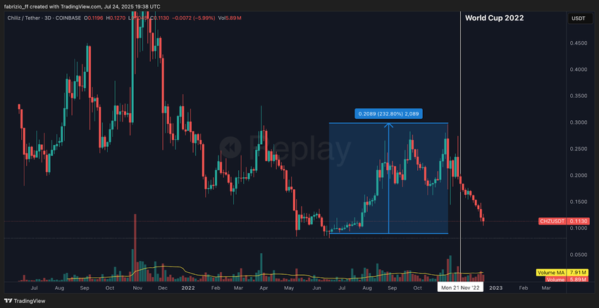 Un ejemplo: en 2022, el token $CHZ de Chiliz vio su precio aumentar más del 200% en los cinco meses previos a la Copa del Mundo.