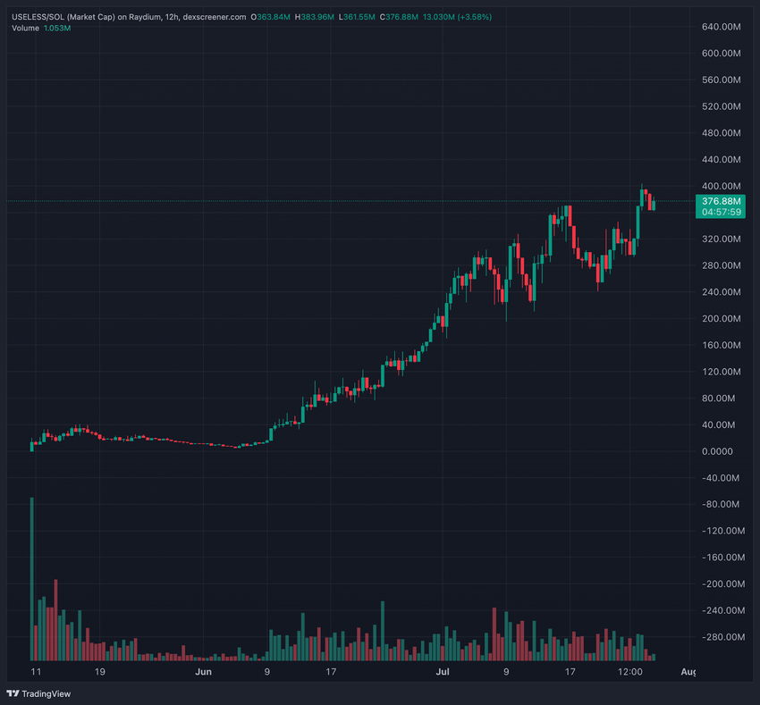 Como otro ejemplo, tomemos $USELESS, un token que se lanzó en mayo de 2025. A pesar de no ofrecer ninguna utilidad, como su nombre sugiere, alcanzó una capitalización de mercado de 377 millones de dólares en un par de meses.