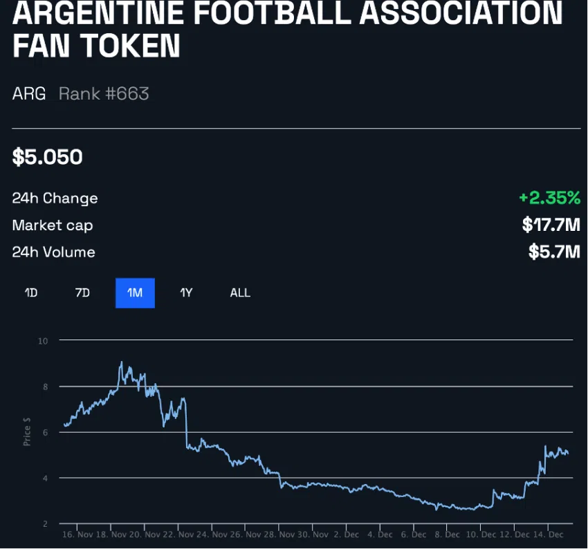 Tras la histórica victoria de Arabia Saudita sobre Argentina, sus respectivos NFT aumentaron las ventas en 387%. En el otro lado del espectro, el fan token ARG de Argentina cayó un 21% después de su pérdida. ARG, sin embargo, logró recuperar algo de valor después de avanzar a la final después de su victoria contra Croacia.