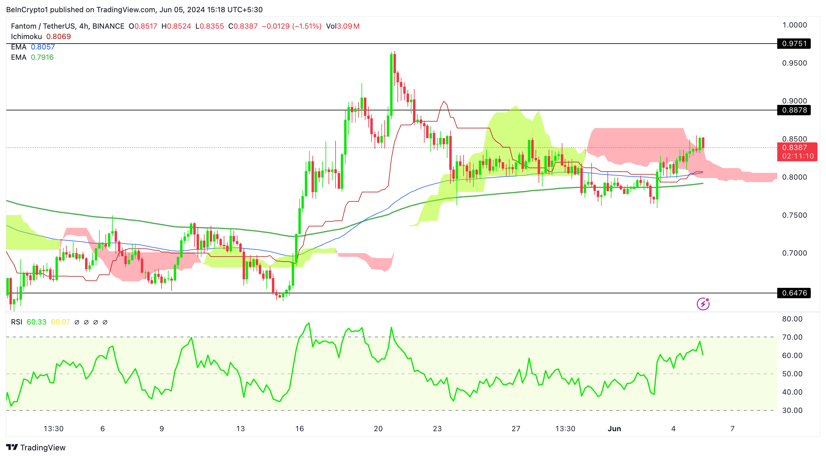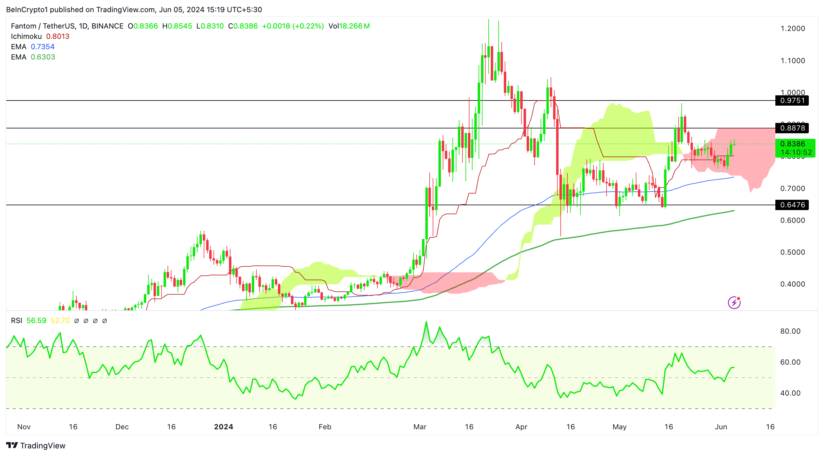 Si el precio supera el límite superior de la nube en 0.88 dólares, podría avanzar hacia 0.97 dólares. Sin embargo, FTM podría testar el límite inferior de la nube si el precio se invierte.