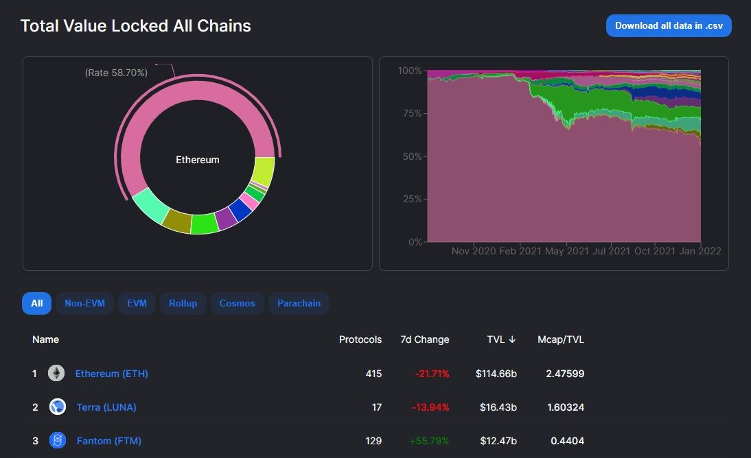 Solo Terra y Ethereum están por encima de Fantom con 15,8 mil millones de dólares y 111,6 mil millones de dólares, respectivamente. El TVL de Binance Smart Chain es de 11,36 mil millones de dólares. El TVL en DeFi es de 188.7 mil millones de dólares. Los tokens bloqueados incluyen los de 129 protocolos.