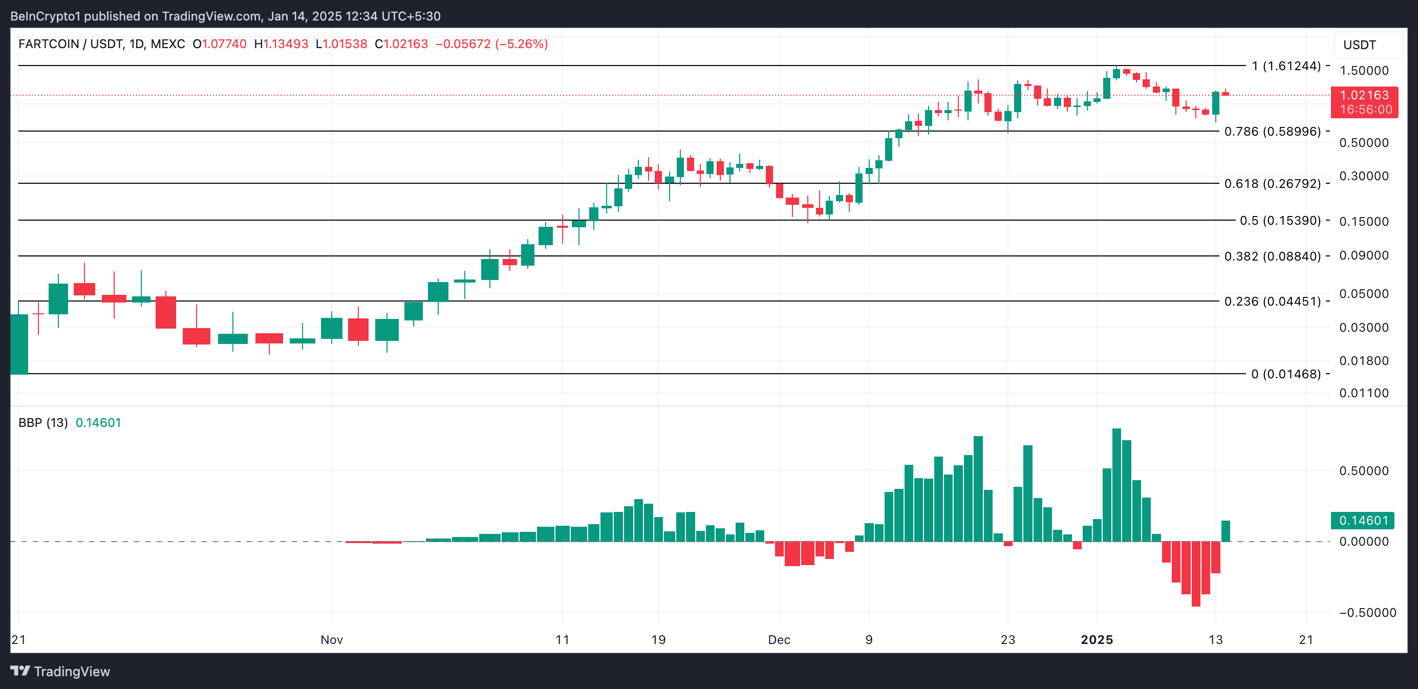 FARTCOIN actualmente se negocia a 1.06 dólar, notando un aumento del 35% en el precio en las últimas 24 horas. Esto ocurre tras una semana de precios en declive, culminando en un mínimo de siete días el lunes.