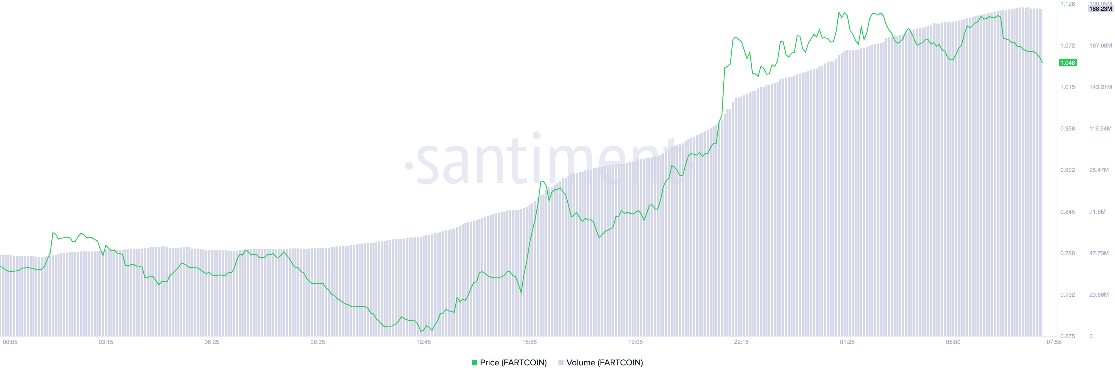 En las últimas 24 horas, el volumen de trading de FARTCOIN se ha disparado un 276%, totalizando 188 millones de dólares.