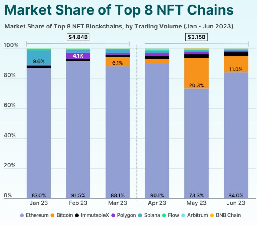 Ethereum continúa albergando la mayor parte de las transacciones de NFT, capturando una participación de mercado del 84 % a partir de junio de 2023.