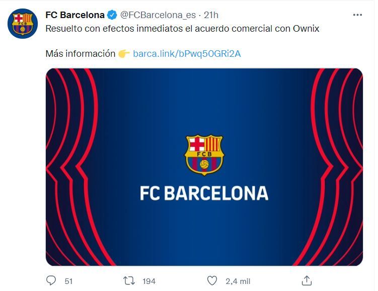 Sponsored“El FC Barcelona comunica que ha resuelto con efectos inmediatos el acuerdo comercial con Ownix para la creación y comercialización de NFTS, activos digitales de nueva creación, a raíz de las informaciones difundidas durante el día de hoy que atentan contra los valores que promueve nuestro Club”.