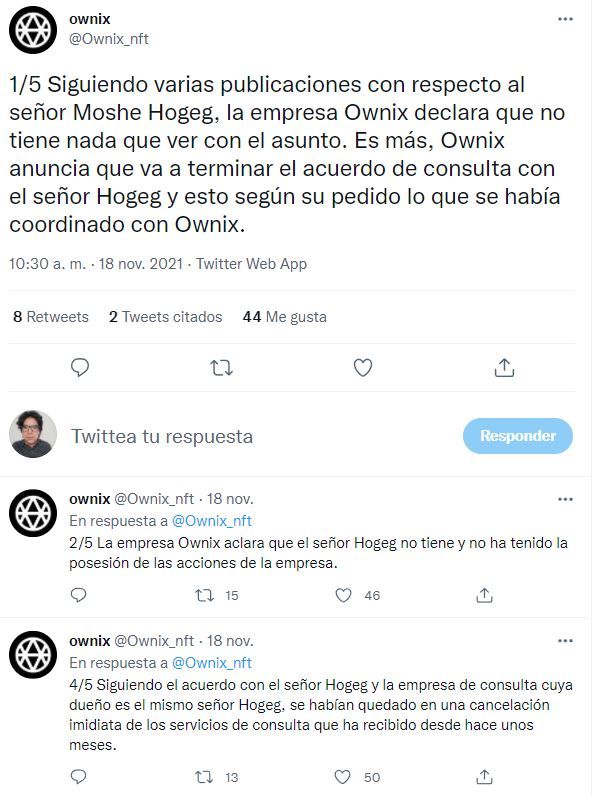 Horas después del anuncio de la cancelación del contrato, Ownix aclaró a través de su cuenta de Twitter que la empresa “no tiene nada que ver con el escándalo”, e incluso adelantó que rescindirán el contrato con Hogeg y ahondó que el empresario “no ha tenido” posesión de acciones de la empresa.