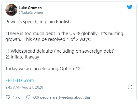Por otro lado, el investigador de economía Luke Gromen sugirió que la Fed no se quedó con otras opciones. O podrían abrazar una inflación más alta, o podrían dejar que la deuda no pagara y causar una crisis aún peor.