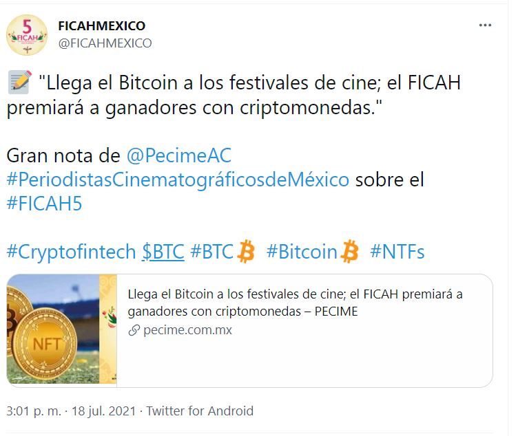 El Festival Internacional Cine de América (FICAH) de Hidalgo, en México, informó que, en su quinta edición, a realizarse del 26 de Agosto al 26 de Septiembre, otorgarán premios en Bitcoin y NFT, convirtiéndose en el primer evento de cine en el país en galardonar a ganadores bajo otros formatos.