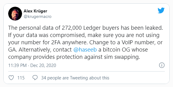 El analista de la industria Alex Krüger advirtió sobre una ola inminente de ataques de SIM swapping luego de la filtración de Ledger. Dado que se filtraron números de teléfono y los teléfonos inteligentes se utilizan normalmente para autenticar transacciones, las consecuencias podrían ser devastadoras: