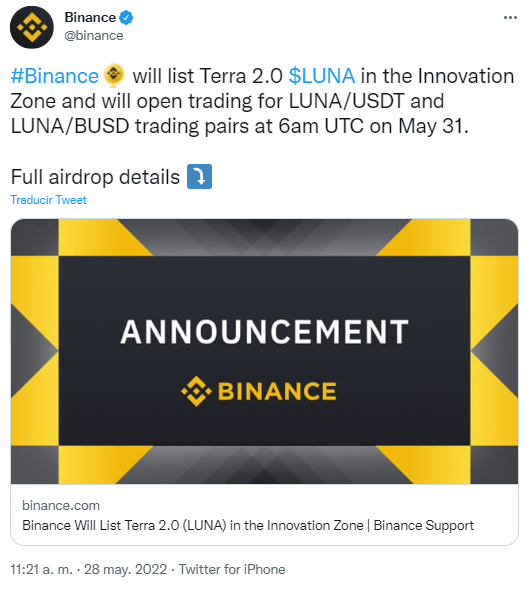 “Abrirá operaciones para los pares de trading LUNA/USDT y LUNA/BUSD a las 6 a. m. UTC el 31 de mayo”.