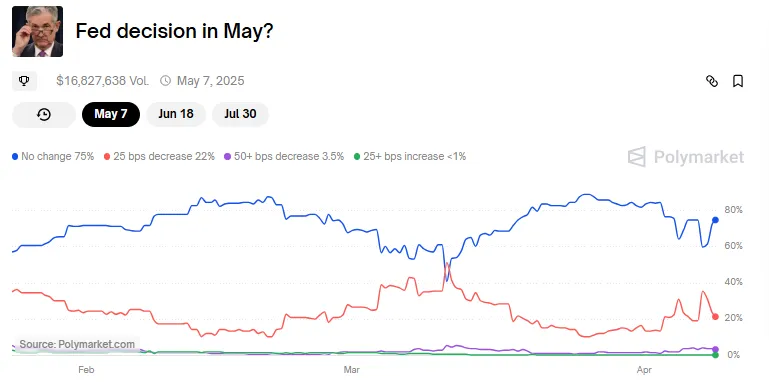 Cuando el QE comenzó en marzo de 2020, las altcoins se dispararon más de 100X para cuando terminó en 2022. Los traders ahora están observando mayo como un posible inicio para la próxima ola de liquidez, con apostadores apostando un 75% de probabilidad de que la Fed mantenga las tasas estables.