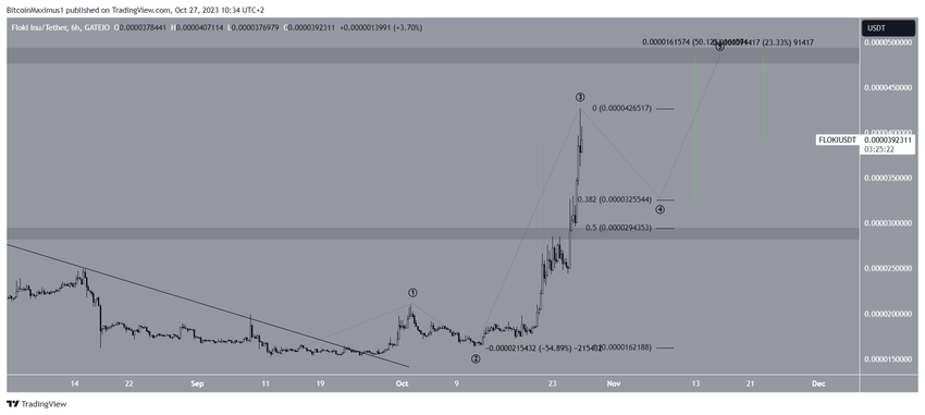 El recuento de ondas más probable es alcista. Sugiere que el precio de FLOKI se está acercando a la cima de la tercera onda en un movimiento ascendente de cinco ondas (negro).