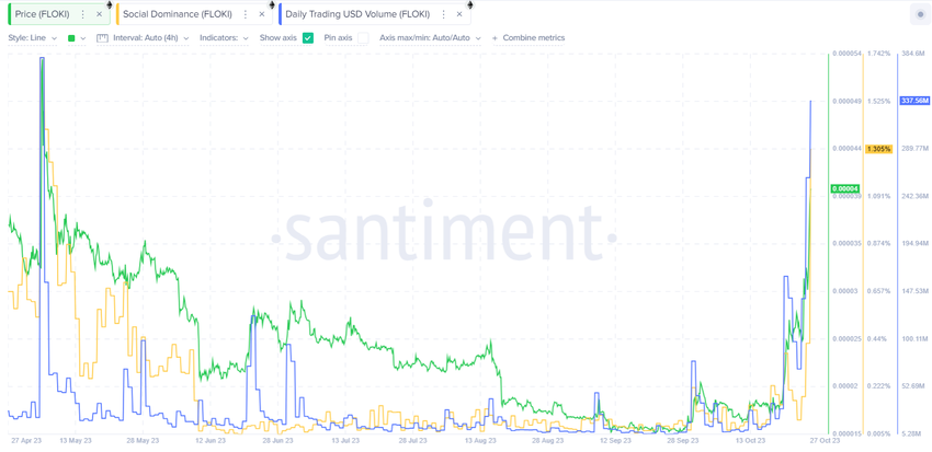 El precio de FLOKI ha aumentado rápidamente desde el 20 de octubre, culminando hoy con un máximo de 0.000042 dólares.