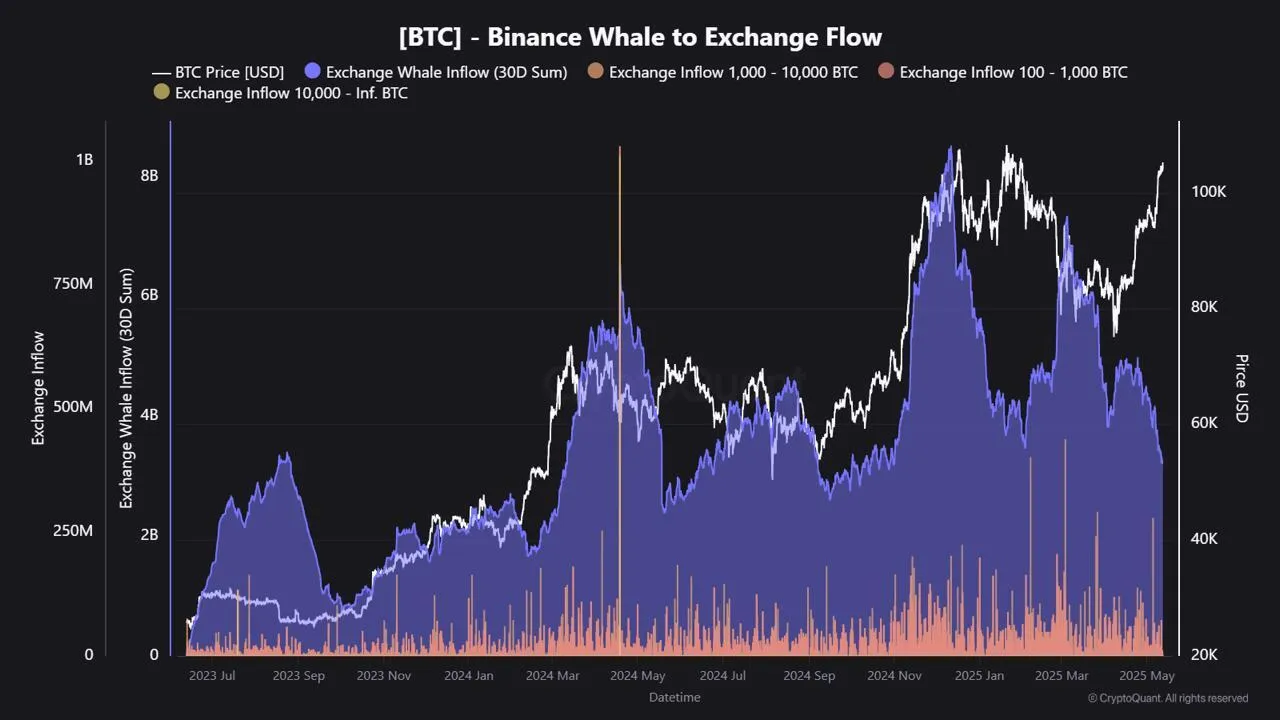 Las ballenas de Bitcoin han movido solo 3,27 mil millones de dólares de BTC a Binance en los últimos 30 días. Esta cifra marca la entrada de ballenas más baja desde noviembre de 2024, según CryptoQuant.