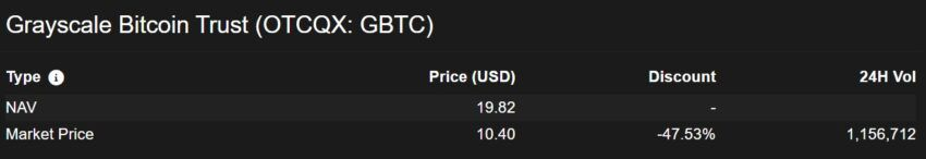 El Grayscale Bitcoin Trust (GBTC) ha bajado a un descuento del 47%. Esta es una rebaja casi récord para el fondo, que experimentó su mayor descuento en diciembre de 2022.