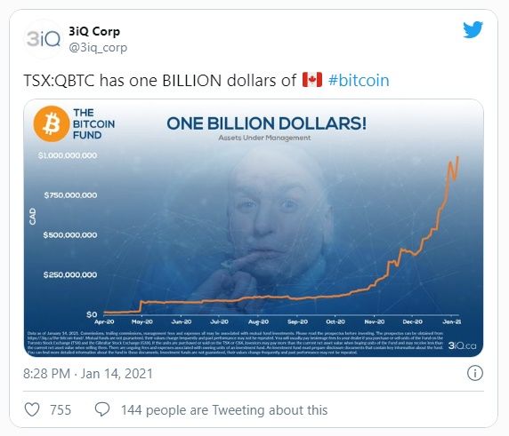 El fondo Bitcoin de 3iQ Corp, con sede en Canadá, acaba de superar un hito importante. La firma informó el viernes que ahora posee más de 1 mil millones de dólares canadienses [aproximadamente USD 785 millones] en BTC.