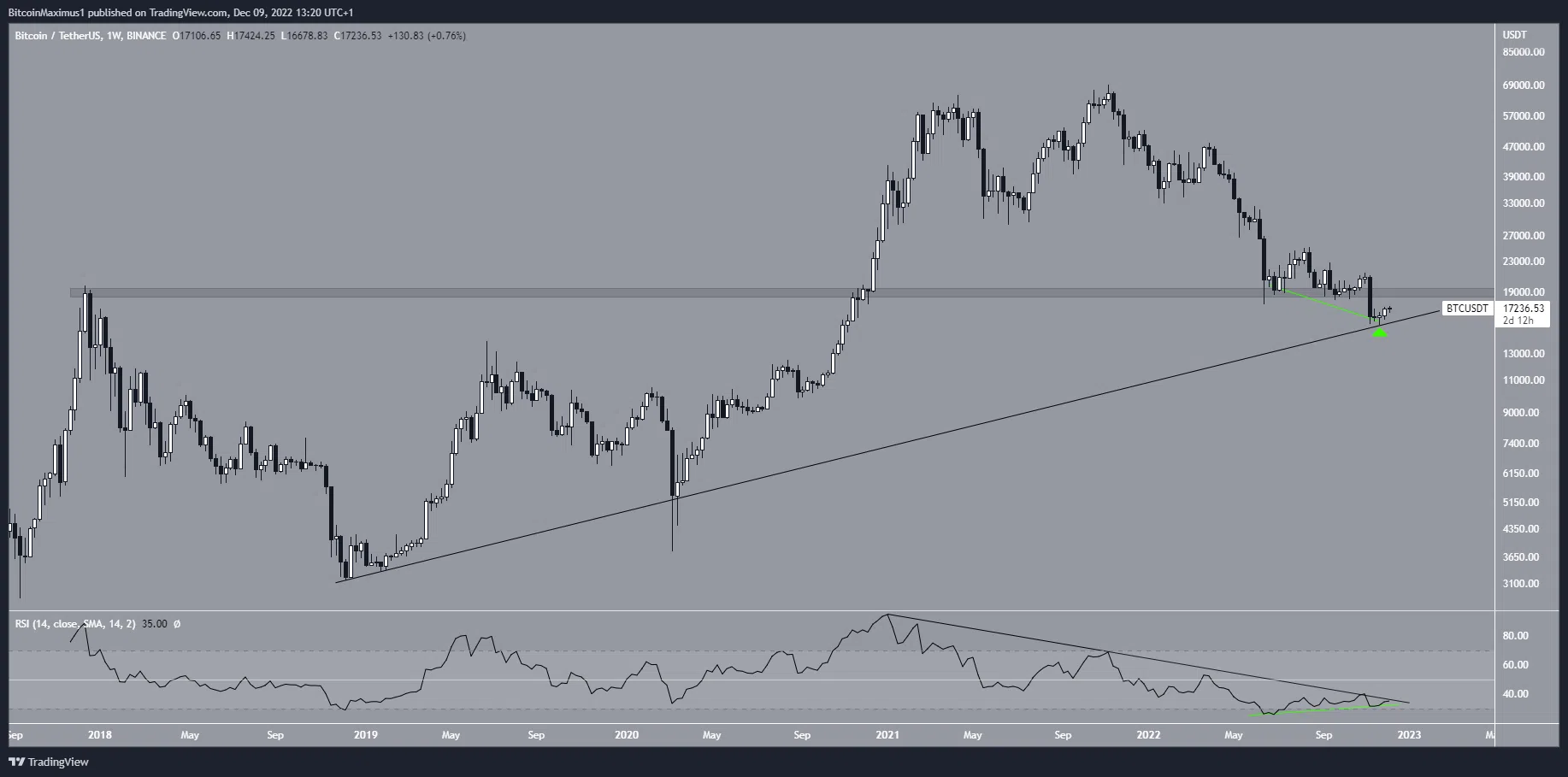Para que la tendencia del precio de Bitcoin se considere alcista, el precio debe recuperar el área de 19,000 dólares. Este es un nivel horizontal crucial, ya que actuó como el máximo histórico en 2017 y después se convirtió en soporte en mayo de 2022.