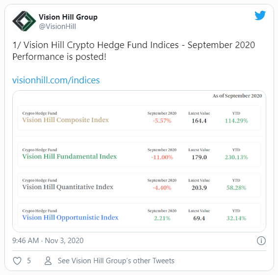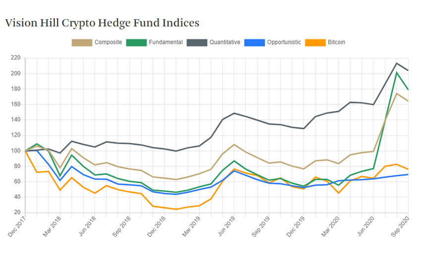 Los fondos de cobertura de criptomonedas tuvieron momentos difíciles en septiembre de 2020, pero están en alza para el año, según los últimos datos de Vision Hill Group, que el 3 de noviembre publicó sus últimos resultados.