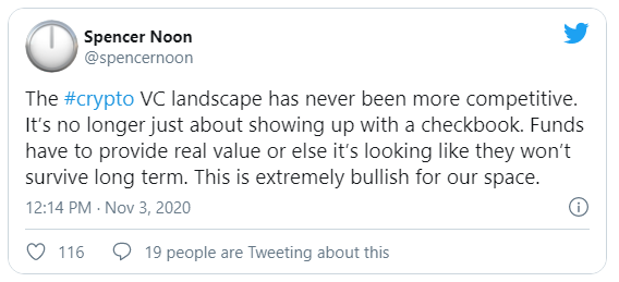 Por cierto, Spencer Noon, jefe de inversiones del fondo de inversión cripto-nativo DTC Capital, señaló cuán competitivo se ve el panorama de VC, diciendo que la responsabilidad está en los fondos para “proporcionar valor real” o “no sobrevivirán a largo plazo”, lo cual considera optimista para la industria.
