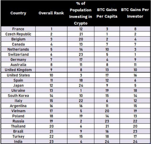 “[Francia] ocupó el puesto 12 en el porcentaje del país invertido en criptomonedas (3,3 %), pero un impresionante tercer y octavo lugar respectivamente en ganancias de bitcoin per cápita y ganancias de bitcoin por inversor, con 275 y 13 dólares, respectivamente. Si bien muchos otros países se ubicaron bien en ciertas categorías, Francia fue el único país que estuvo por encima del promedio en las tres métricas”.