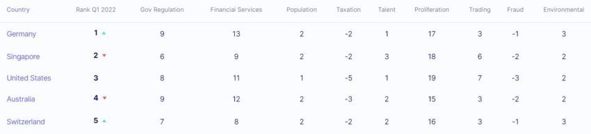 Según otro estudio de Coincub, Suiza también ha mostrado una mejora considerable, subiendo ocho posiciones al número cinco en el Q1 International Crypto Ranking, 2022.
