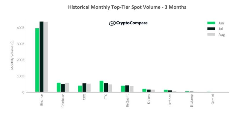 El informe señaló los volúmenes de los exchanges individuales durante los últimos tres meses, destacando que Binance (Grado AA) fue el mayor spot exchange de primer nivel por volumen en agosto, cotizando 438 mil millones de dólares.