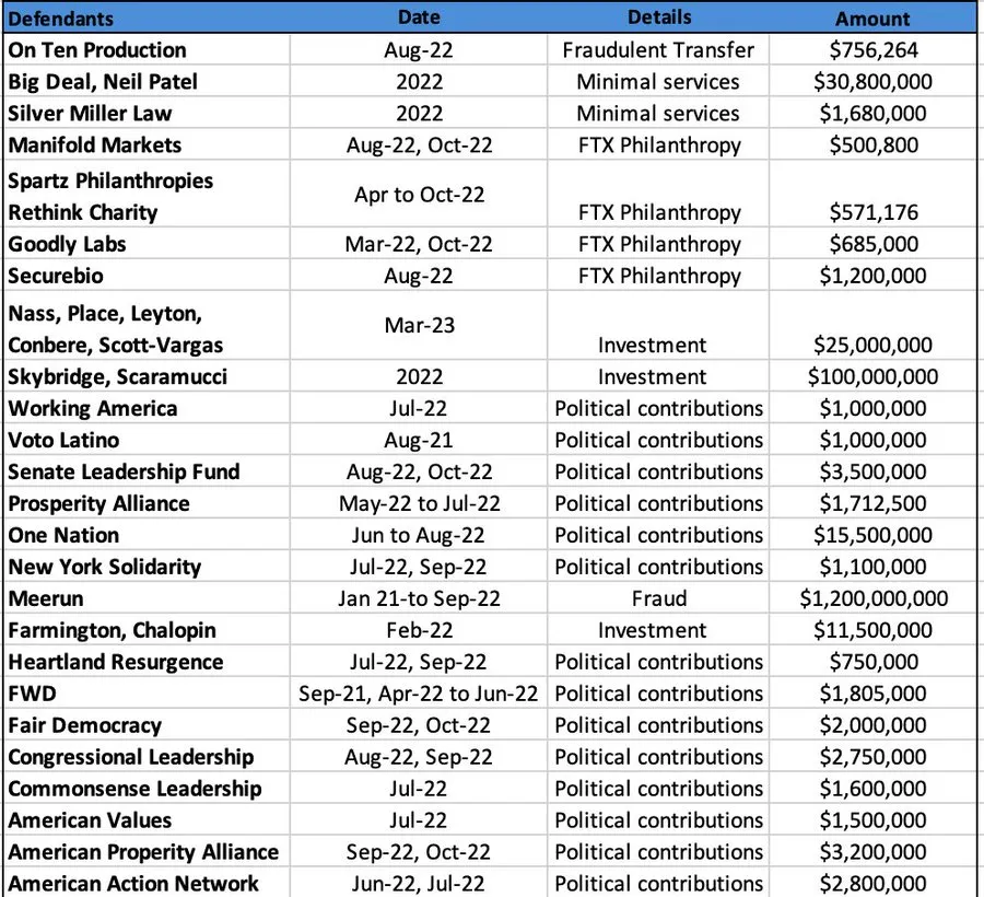 Según documentos del expediente de quiebra de FTX, la mayoría de los últimos archivos abordan diversas reclamaciones, incluyendo contribuciones políticas, los esfuerzos filantrópicos del exchange extinto, inversiones y alegaciones de fraude y manipulación del mercado: