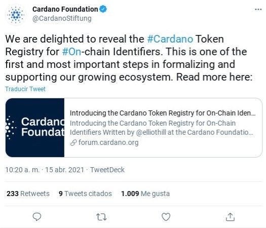 De acuerdo al anuncio oficial publicado por Cardano el 15 de abril, el Registro brinda a los usuarios acceso al verdadero carácter de los tokens nativos implementados en la blockchain a través de metadatos legibles por humanos y otra información descriptiva.