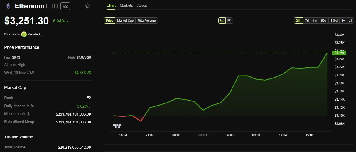 Los datos de BeInCrypto muestran que el precio de Ethereum ha subido más del 5% desde que la sesión del jueves abrió. Al momento de escribir esto, ETH se negociaba por 3,251 dólares.