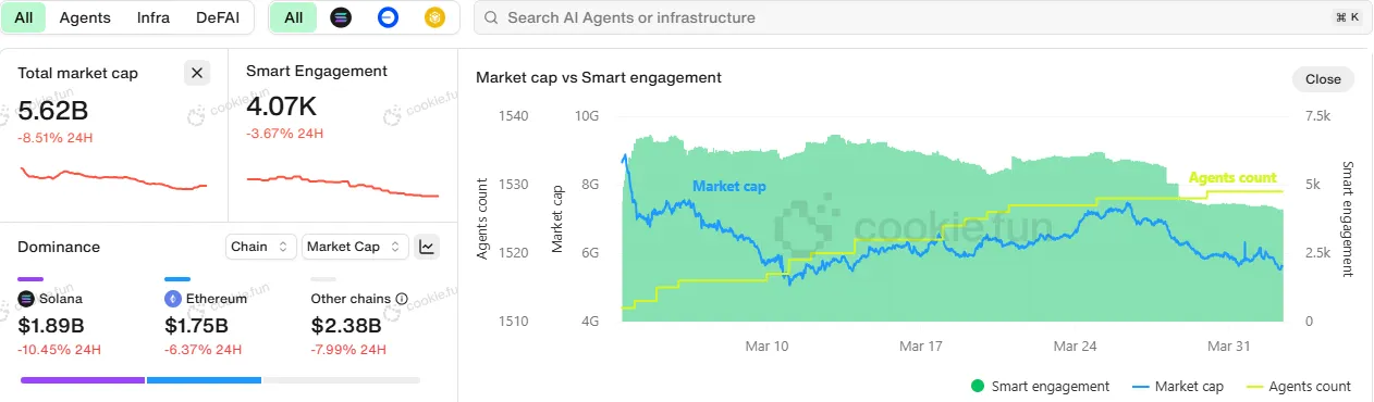Además, la capitalización de mercado de los tokens de agentes de IA ha caído casi 10% a 5,62 mil millones de dólares en las últimas 24 horas. Estos datos reflejan un entusiasmo menguante de los inversores y sugieren que el entusiasmo en torno a las soluciones de criptografía impulsadas por IA se está enfriando.