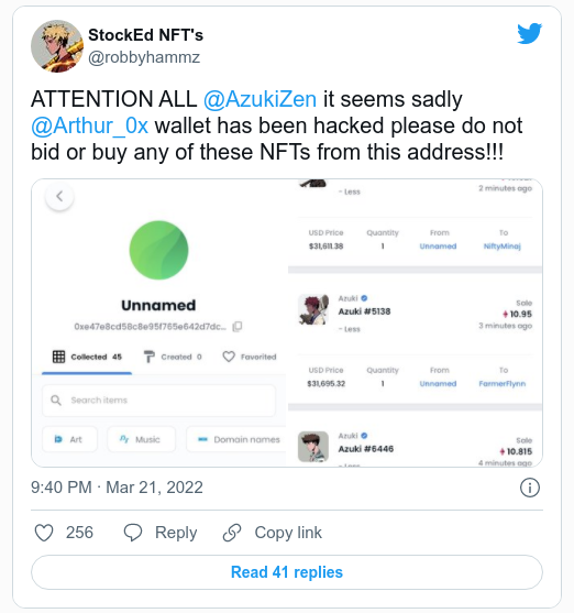 La comunidad también ha advertido contra las ofertas o la compra de tokens no fungibles desde la dirección. Algunos de los Azuki NFT que tenía en su poder se vendieron a bajo precio en el marketplace NFT OpenSea.