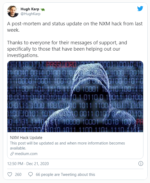 El 14 de diciembre, el fundador de Nexus Mutual, Hugh Karp, tuvo una desagradable sorpresa cuando lo engañaron para que realizara una transacción con la dirección de un atacante a través de MetaMask. Esto resultó en la pérdida de 370,000 tokens Nexus Mutual (NXM) por un valor de alrededor de 8.4 millones de dólares en ese momento.