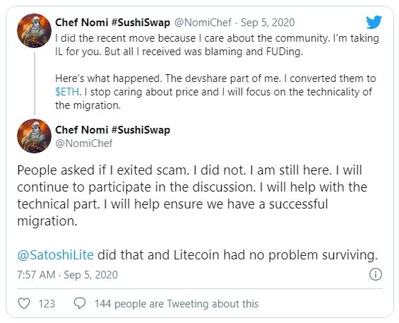 El Chef fundador de SushiSwap, Nomi, salió en su propia defensa en Twitter, insistiendo en que no era un exit scam porque todavía están presentes: