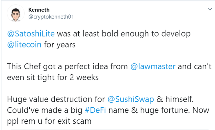 Cripto Twitter se apresuró a acusar a Chef Nomi por lo que muchos alegan es un exit scam, y algunos defendieron a Lee de Litecoin, quien modeló el código a partir de Bitcoin.