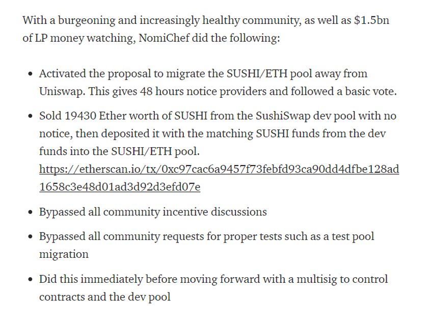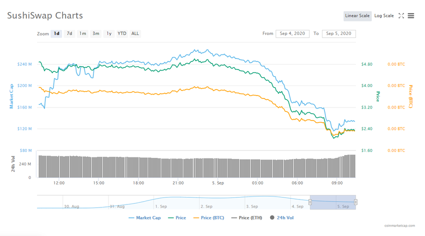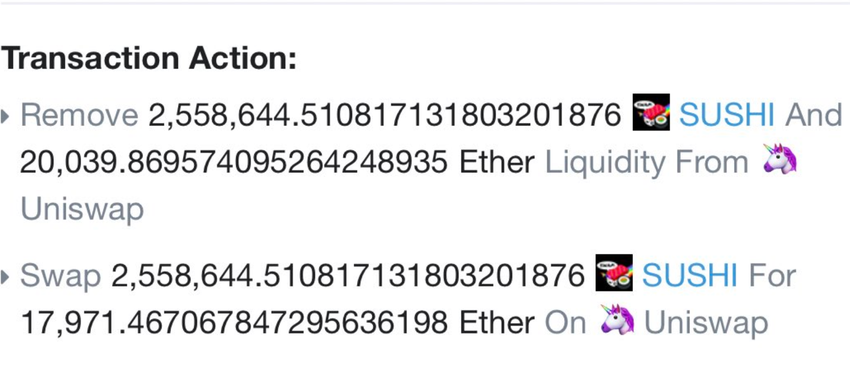 En lo que ha sido acusado de ser un exit scam, Chef Nomi, el anónimo fundador de SushiSwap, vendió un total de 8 millones de dólares en SUSHI, lo que provocó que se profundizara la debacle y, al mismo tiempo, que el precio bajara más del 50% en el ínterin.