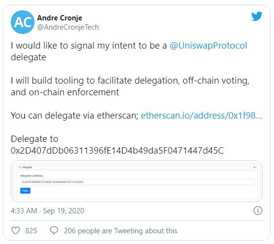 Uno de los interesados en convertirse en delegado de gobierno de Uniswap es Andre Cronje. El fundador de YEARN Finance tuiteó como tal el sábado temprano: