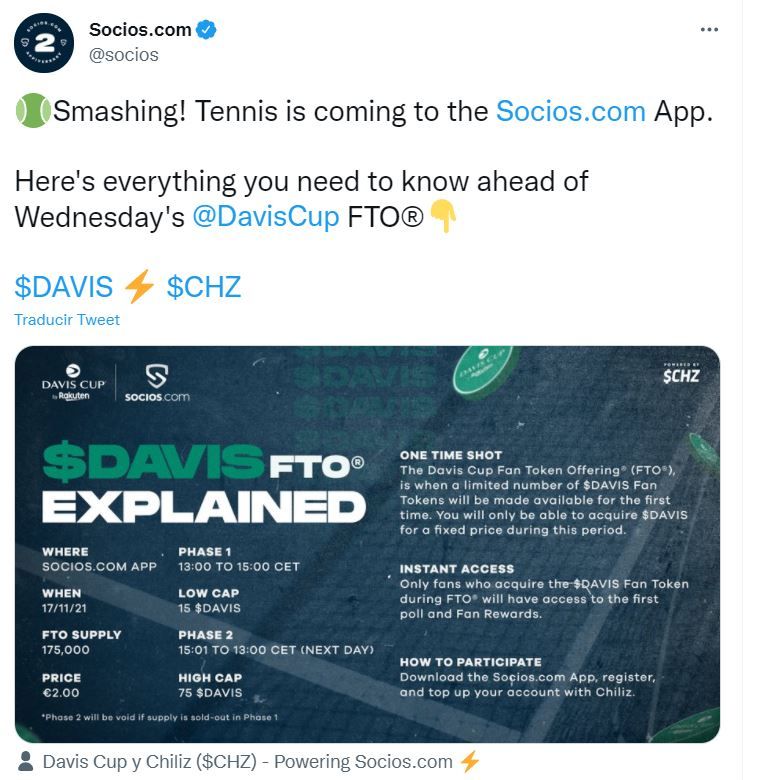 Los fan token saldrán a la venta el 17 de noviembre, a través de Socios.com. Serán 175,000 activos denominados Fan Token $DAVIS y costarán 2 euros y será el primer lanzamiento en blockchain de la Copa Davis, gracias al acuerdo con Kosmos Tennis.