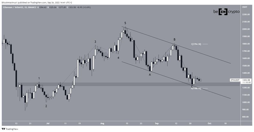 El 21 de septiembre, ETH alcanzó un mínimo de 1,220 dólares y rebotó. Este movimiento sirvió para validar el área de soporte horizontal de 1,250 dólares y la línea de soporte del canal. Además, dio a las ondas A:C una proporción exacta de 1:1. Como resultado, es muy probable que la corrección esté completa.