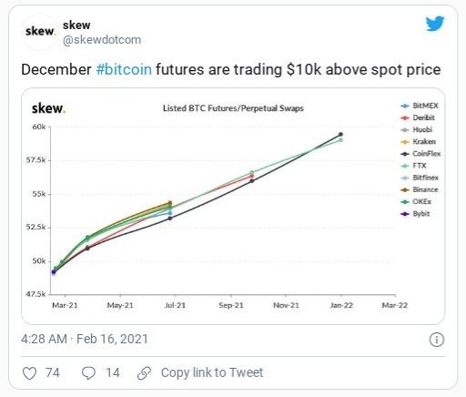 Los futuros de Bitcoin (BTC) para diciembre de 2021 se cotizan aproximadamente a 10,000 dólares por encima del precio spot actual, según datos de Skew.