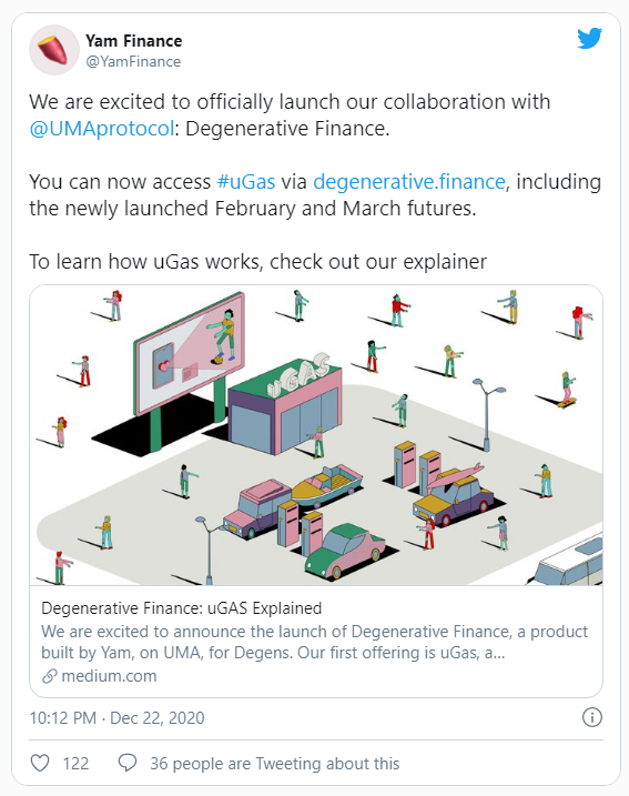 Yam Finance, en asociación con UMA, ha lanzado algo llamado “Finanzas degenerativas”. Su primera oferta es uGas, un contrato de futuros sintéticos que se liquida al final de cada mes de acuerdo al precio promedio de 30 días del gas Ethereum .