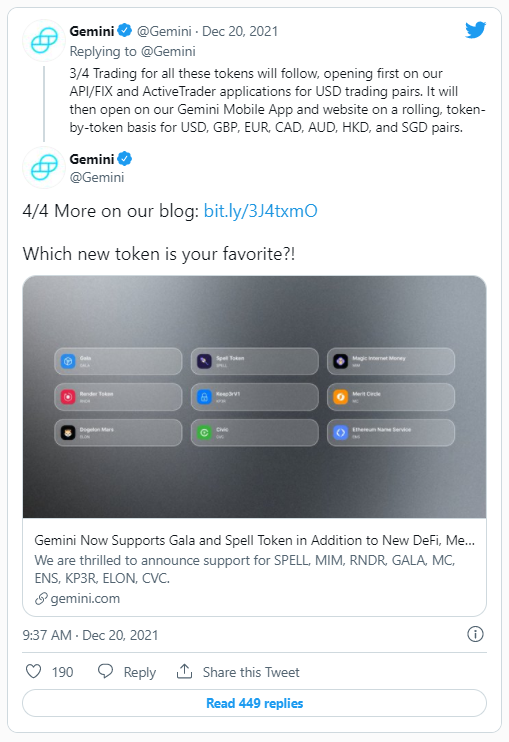 El exchange Gemini anunció el lunes 20 de diciembre la lista de nuevos tokens, incluido el GALA. La lista completa incluye Spell (SPELL), Magic Internet Money (MIM), Render (RNDR), Merit Circle (MC), Ethereum Name Service (ENS), Keep3rV1 (KP3R), Dogelon Mars (ELON) y Civic (CVC).