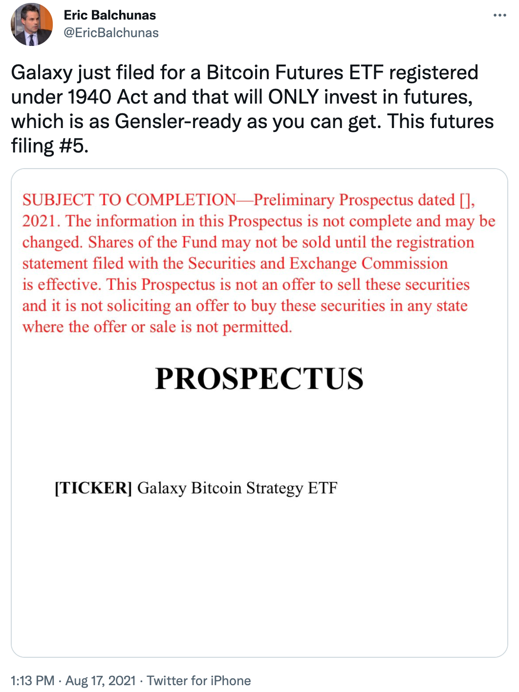 Hace apenas unos minutos del 17 de agosto, Eric Balchunas, experto de ETF’s de Bloomberg, ha lanzado la confirmación de que Galaxy Digital, un servicio financiero prominente de la industria cripto que se enfoca en la inversión institucional, ha registrado un Bitcoin Futures ETF en el cual sólo invertirá en futuros. Según Balchunas, esto representa el quinto registro para futuros de Bitcoin no obstante tendrá que ser analizado por la U.S. Securities and Exchange Commission (SEC), entidad regulatoria del mercado estadounidense.