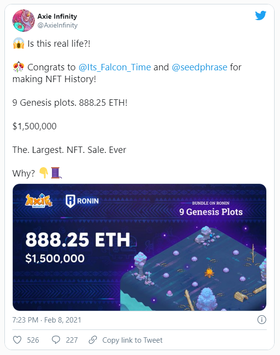 SponsoredLa plataforma de juegos blockchain inspirada en Pokémon, Axie Infinity, ha informado de una nueva venta récord de NFT establecida por dos jugadores. Un usuario con el apodo de “Flying Falcon” ha distribuido 888.25 Ethereum (ETH) (aproximadamente 1.5 millones de dólares) al usuario “Danny” a cambio de nueve parcelas de Genesis de tierra virtual.