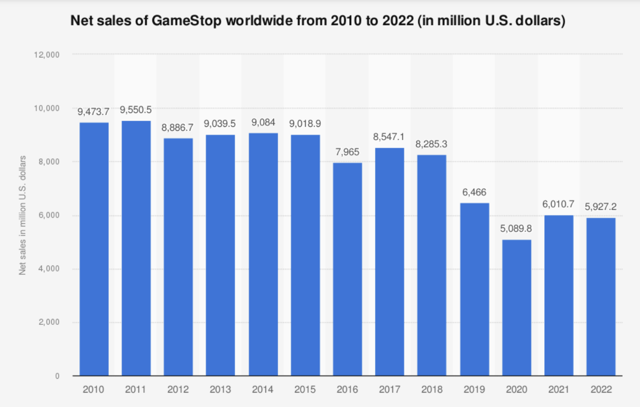 Pero el éxito de antaño se detuvo tras la disminución de juegos en físico y el aumento de las ventas digitales. De un momento a otro, la necesidad de ir a GameStop para comprar el nuevo juego del año desapareció y con ella también se fueron las ganancias.