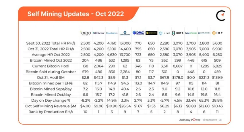 Argo también vendió 579 BTC en octubre de 2022, elevando su tenencia total de Bitcoin a 138 BTC. Según Compass Mining, este alijo de Bitcoin, junto con cualquier Bitcoin extraído en noviembre de 2022, hará que la empresa no pueda cubrir los costos operativos.