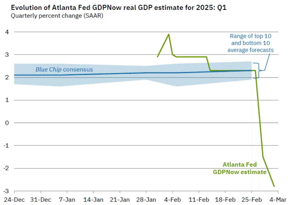 La Fed ahora predice que el PIB de Estados Unidos se reducirá un 2,8% para el final del primer trimestre de 2025. Desde una perspectiva económica, esto es apocalíptico comparado con sus predicciones de hace cuatro semanas, que mostraban un crecimiento del 3,9%.