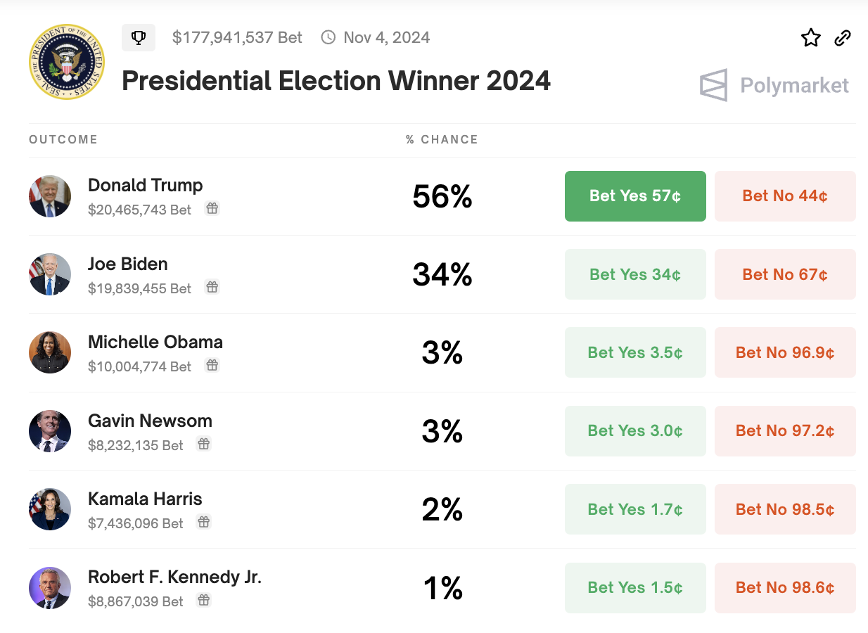Datos recientes de la plataforma de predicción descentralizada, Polymarket, muestran que Donald Trump tiene un 56% de preferencias de los electores para las votaciones presidenciales de Estados Unidos. En tanto, Joe Biden tiene 34%, Michelle Obama, un 3% y otros contendientes como Kamala Harris y Robert F. Kennedy Jr, tienen el 3%, 2% y 1%, respectivamente.