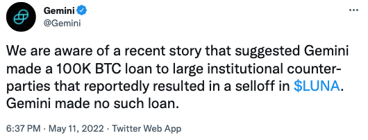 “Estamos al tanto de una historia reciente que sugiere que Gemini hizo un préstamo de 100,000 BTC a grandes contrapartes institucionales que supuestamente resultó en una venta de $LUNA. Gemini no hizo tal préstamo”.